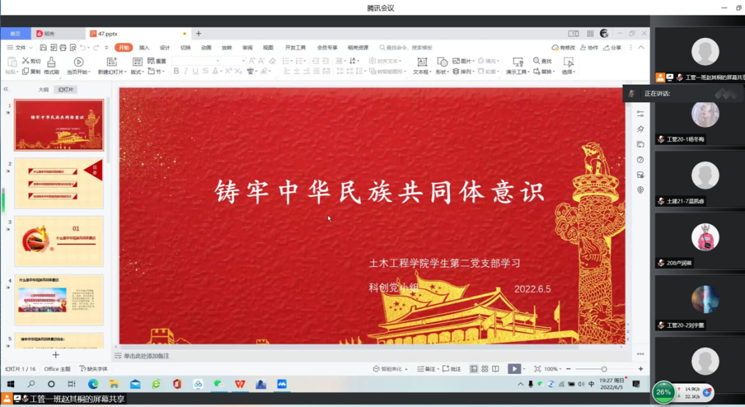 2022年6月5日19:30,yl8858永利集团学生第二党支部通过腾讯会议开展了以“铸牢中华民族共同体意识”为主题的党小组学习。参加本次学习的有二支部科创党小组、宣传党小组、活动党小组、学习党小组的全体党员和积极分子。