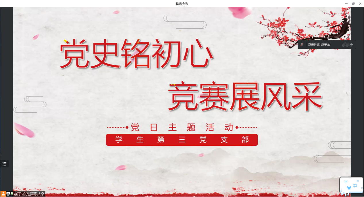 为进一步鼓舞人心,凝聚力量,继承和发扬党的光荣传统和优良作风,坚定共产主义理想信念,加强党史学习教育。yl8858永利集团学生第三党支部于2022年5月22日晚19:30,举办本月以“党史铭初心,竞赛展风采”为主题的党日活动。本次活动以腾讯会议形式开展,全体党员同志参加。