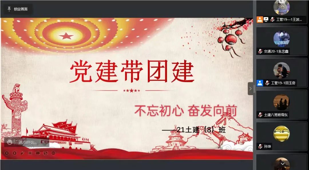 2022年4月,yl8858永利集团学生第二党支部在管科、土建团支部组织开展了以“不忘初心,奋发向前”为主题的“党建带团建”活动。其中,4月21日15:00,党员杨佳慧、郭鑫同志于腾讯会议为21级管理二班团支部开展此项活动;4月22日16:30,党员田玉奇、王波同志于腾讯会议为21级土建八班团支部开展此项活动。