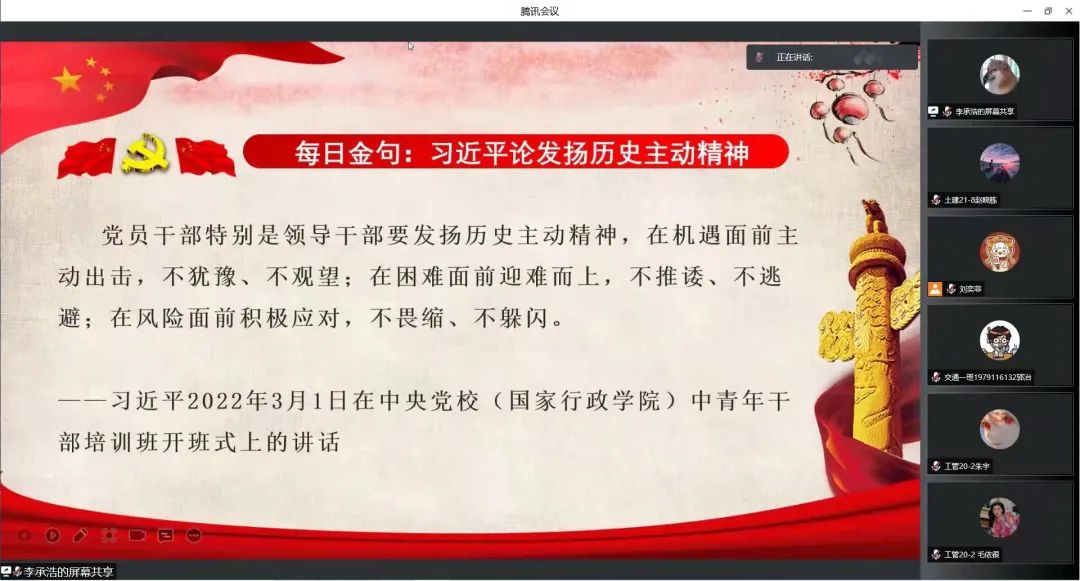 最后,由党员李承浩同志进行金句领读:党员干部特别是领导干部要发扬历史主动精神,在机遇面前主动出击,不犹豫、不观望;在困难面前迎难而上,不推诿、不逃避;在风险面前积极应对,不畏缩、不躲闪。