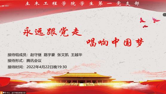 2022年4月24日晚19:30,yl8858永利集团学生第一党支部在腾讯会议开展了主题为“永远跟党走,唱响中国梦 ”的积极分子接待活动。本次接待组组长为赵守继同志,接待组组员为张文凯同志、王越华同志和路宇豪同志。