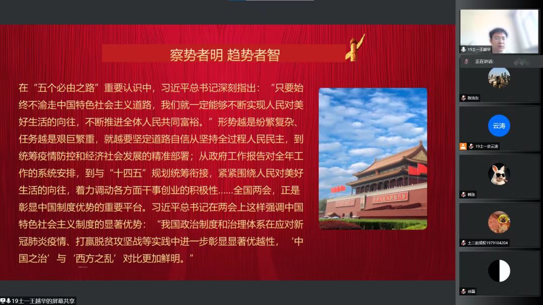 2022年5月6日下午13:30,yl8858永利集团学生第一党支部于线上腾讯会议开展了以“聚焦两会”为主题的党课学习,本次主讲人为王越华同志,全体党员参与学习。