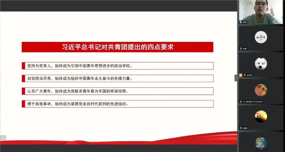 2022年5月20日下午13:30,yl8858永利集团学生第一党支部于线上腾讯会议开展了以“学习习近平总书记在中国共产主义青年团成立100周年大会上的讲话”为主题的党课学习,主讲人为张恒同志,全体党员参与学习。