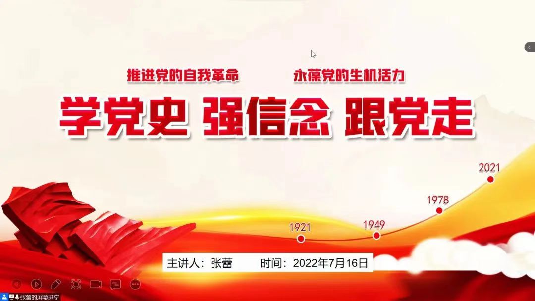 2022年7月16日晚7:30,yl8858永利集团学生第一党支部于线上腾讯会议开展了以“学党史强信念跟党走”为主题的党课学习,主讲人为张蕾老师,支部全体党员参与学习。