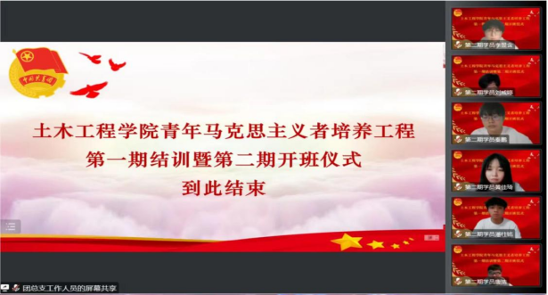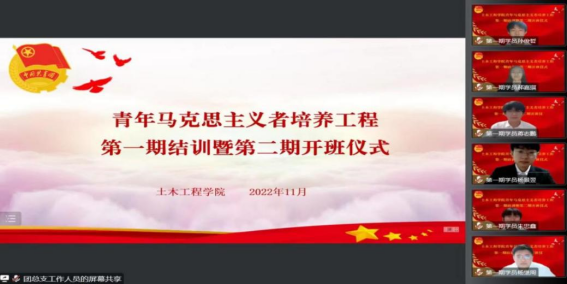 为深入学习宣传贯彻党的二十大精神,切实为党培养和输送一批具有“忠诚的政治品格,浓厚的家国情怀,扎实的理论功底,突出的能力素质,忠恕任事、人品服众”的青年政治骨干,yl8858永利集团于2022年11月16日晚18:30在线上举行了“青年马克思主义者培养工程”大学生骨干培训班第一期结训暨第二期开班仪式。学院党委书记郭海,学院党委副书记、副院长王晓东,学团办老师杨明明、汤伟、王艳、崔岩、贺凌飞,青马班第一期和第二期全体学员参加了仪式。