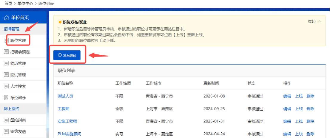 点击【招聘管理】—【职位管理】—【发布职位】,填写职位基本信息并提交后,由学校管理员和省级管理员审核,审核通过后该职位将在学校就业网显示。
