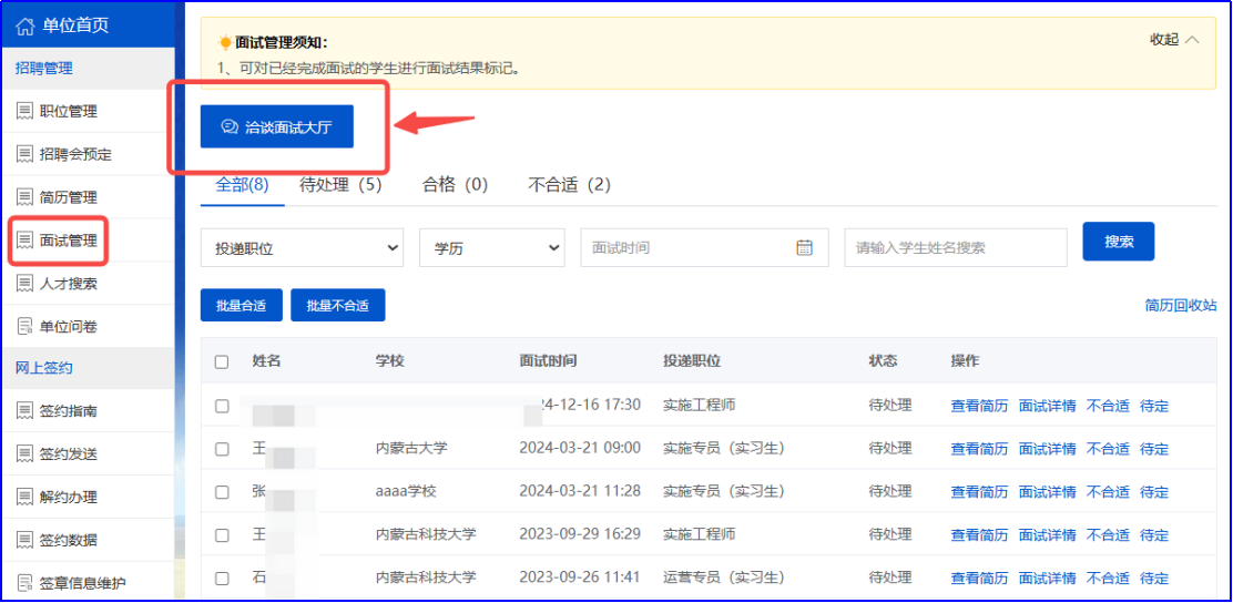 勾选有意向的学生后,点击【批量面试邀请】,可批量给学生发送短信或邮件,邀请学生进行线上和线下面试。邀请学生进行视频面试后,点击【招聘管理】—【面试管理】—【洽谈面试大厅】,单位可与学生进行洽谈和面试。