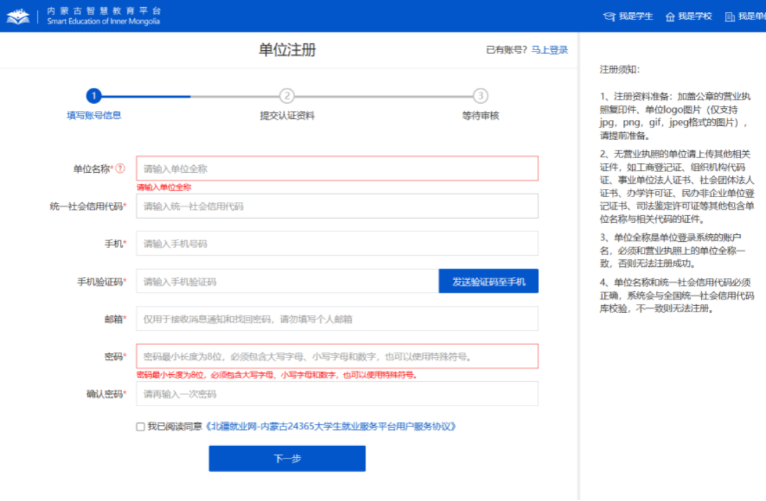 访问内蒙古大学生就业服务平台(www.nmbys.cn),点击右上角【我是单位】进行账号注册或登录。