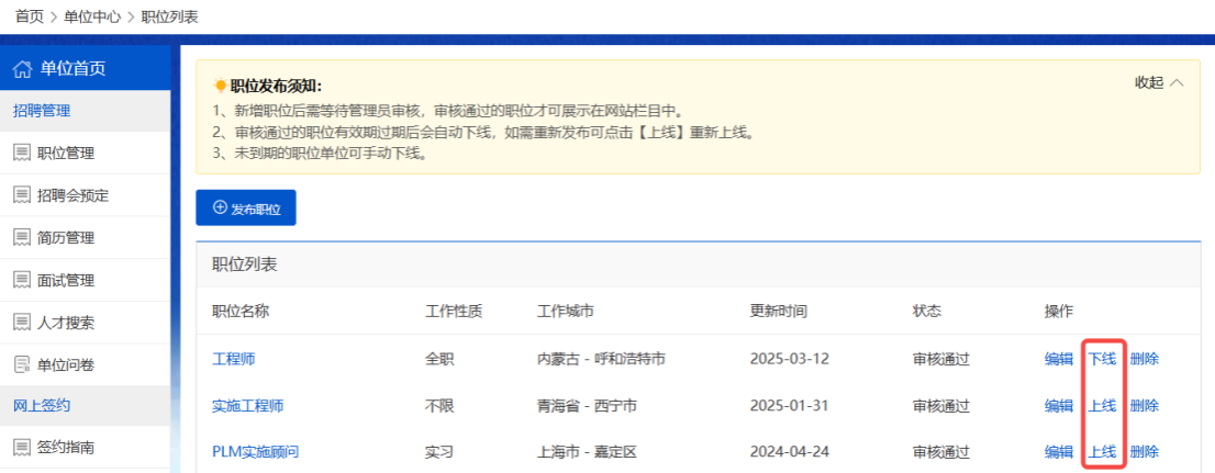 职位有效期默认为1个月,最长90天,到期将自动下线;可以点击右侧的“下线”或“上线”设置职位的显示状态。