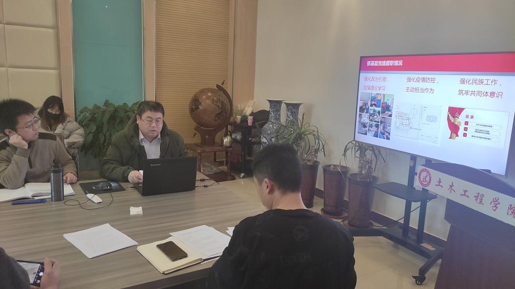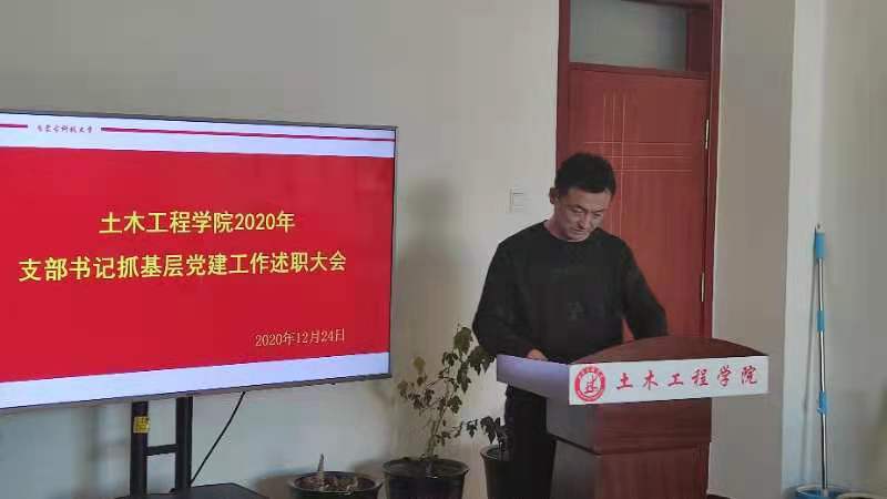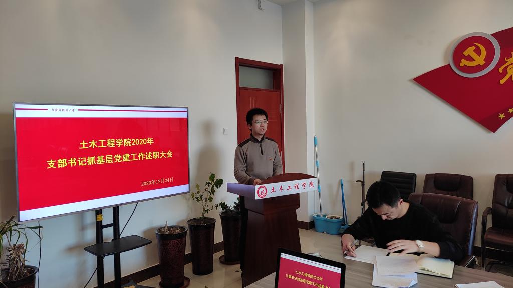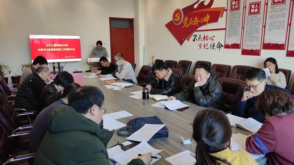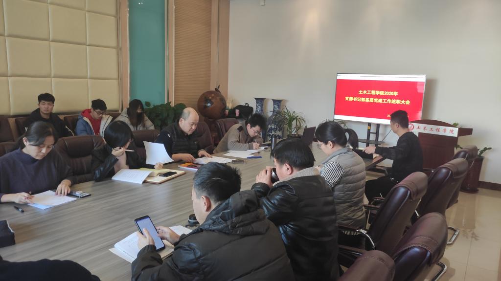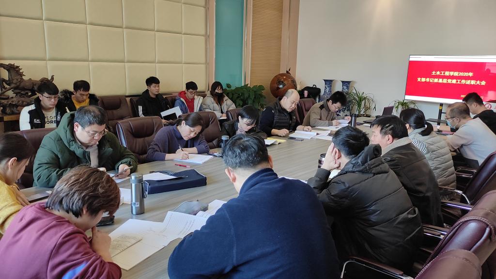 学院党总支书记陈明采取“一述一评”的方式对各党支部书记述职情况进行了逐一点评。他指出,2020年,土木工程系教工党支部“全国党建工作样板支部”完成验收,学院党总支“全国党建工作标杆院系”建设稳步推进,各党支部在做好疫情防控、推行使用国家统编教材等重点任务中勇于担当、积极作为,取得的成绩值得肯定,但在工作中还存在着一些短板和不足,在今后的工作中,要进一步强化党员发展、教育、管理工作,筑牢基层党组织战斗堡垒;要发挥好课堂教学主渠道作用,扩大课程思政教育教学改革覆盖面,着力推进党建工作与学院中心工作融合发展、相互促进,进一步统一思想,凝心聚力、攻坚克难,持续推动党建与业务工作双促进、双提升。