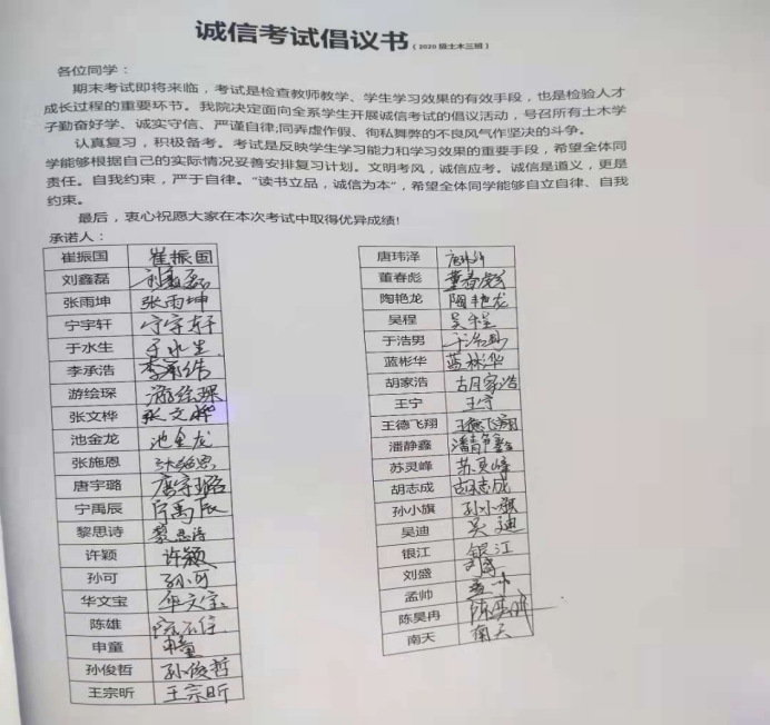 诚实守信是中华民族的传统美德,是我们立身、修德、处事的基本原则,更是当代大学生义不容辞的责任。同学们应严格遵规守纪,不存侥幸心理,尊重考试,尊重自己,尊重监考老师,服从管理,严肃考风,以君子之礼成君子之事。