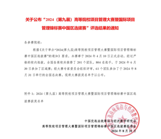 高等院校项目管理大赛是由华罗庚教授创立的中国优选法统筹法与经济数学研究会主办,由其下设的项目管理研究委员会(PMRC)负责组织实施,面向高等院校在校学生的全国性项目管理学科创新性竞赛,同时也是“国际项目管理锦标赛(PMC)”的中国区选拔赛,目的在于进一步推动项目管理理论和实践成果在中国高等院校青年大学生中的普及和应用,促进中国项目管理的专业化、信息化、国际化和项目经理的职业化。PMC是由国际项目管理协会(IPMA)主办,面向全球高校学生的国际性项目管理创新性竞赛,高等院校项目管理大赛至2024年已举办至第九届,在大赛中获奖即可对标获得国际IPMP职业资格证书,具有极高的含金量和认可度。
