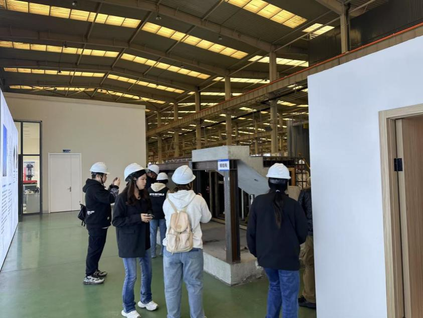 在自治区装配式建筑示范基地—内蒙古绿创智造工业科技有限公司,师生们系统观摩了智能化预制构件生产线。通过技术总监的现场讲解,同学们深入理解了基于BIM的深化设计、自动化精准下料、机器人协同焊接等先进工艺,并就构件标准化生产、质量追溯体系等专业问题与企业专家展开深入探讨。全流程的工业化建造场景,使书本中的"装配式建筑"概念转化为生动的产业实践认知。