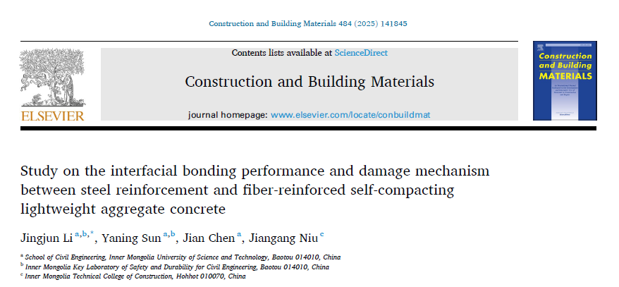 近日,yl8858永利集团工业与城市固体废弃物建材资源化利用团队李京军教授在Construction and Building Materials期刊(IF=8.0,中科院1区TOP)发表题为“Study on the interfacial bonding performance and damage mechanism between steel reinforcement and fiber-reinforced self-compacting lightweight aggregate concrete”(DOI: 10.1016/j.conbuildmat.2025.141845)的研究成果。该研究系统探究了纤维增强自密实轻骨料混凝土与钢筋的界面粘结性能与损伤机理,通过11组中心拔出试验分析了强度等级、纤维掺量与钢筋直径对粘结滑移行为的影响,结合有限元模拟揭示了损伤机制,建立了极限粘结强度计算公式与粘结-滑移本构模型,并验证了纤维桥联效应对抑制裂缝扩展的关键作用。