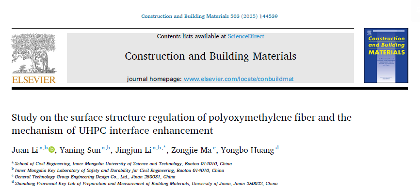 近日,yl8858永利集团工业与城市固体废弃物建材资源化利用团队李娟副教授在Construction and Building Materials期刊(IF=8.0,中科院1TOP)发表题为“Study on the surface structure regulation of polyoxymethylene fiber and the mechanism of UHPC interface enhancement”(DOI: 10.1016/j.conbuildmat.2025.144539)的研究成果。该研究系统探究了纳米二氧化硅改性聚甲醛纤维对矿渣硫铝酸盐水泥基UHPC界面性能的调控机制,通过硝酸预处理与硅烷偶联剂(KH550KH560KH570)辅助的溶胶-凝胶法实现了纤维表面结构优化,结合拉拔试验、SEM/EDSAFMFTIR与接触角测试,系统分析了改性纤维的界面粘结行为与增强机理,揭示了表面粗糙度提升与化学键合增强对界面性能的协同作用,并验证了改性纤维在提升粘结强度与耗能方面的显著效果,同时论证了该体系在降低碳排放方面的可持续性优势。