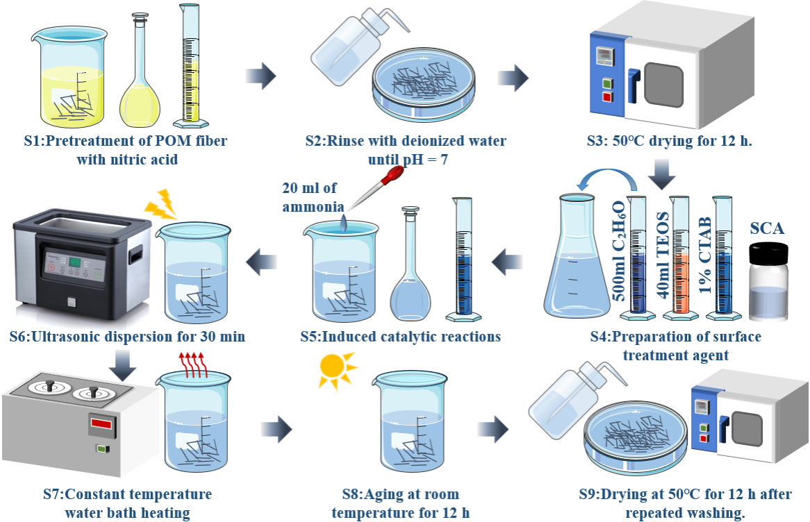 该研究通过系统实验揭示了硝酸预处理与硅烷偶联剂协同增强聚甲醛纤维-基体界面的物理化学机制,阐明了表面粗糙化提升机械咬合与纳米SiO2桥联促进化学键合的共同作用原理,为低碳UHPC的纤维界面设计与性能调控提供了关键理论依据。