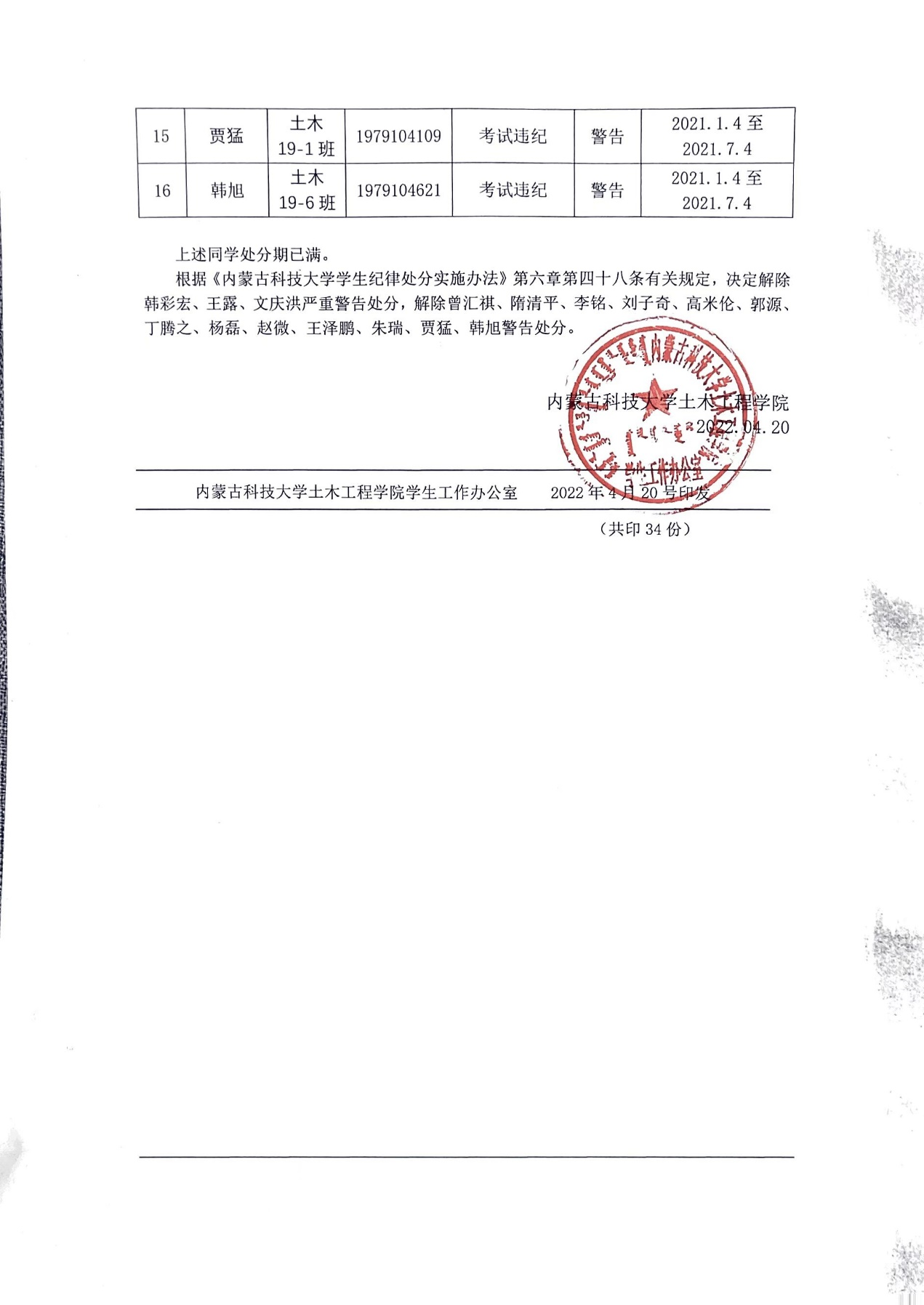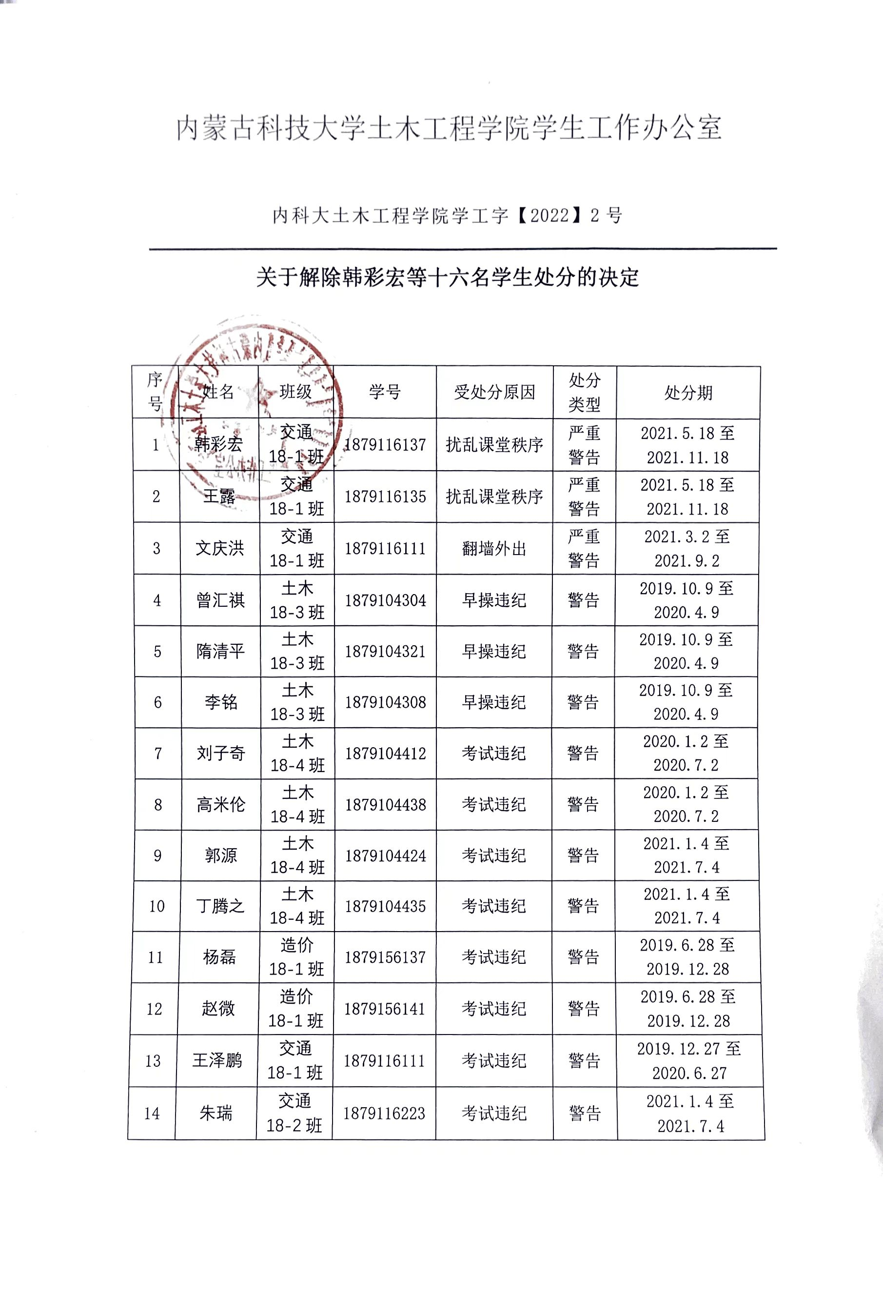 (一)根据《永利官网学生纪律处分实施办法》第六章第四十八条有关规定,决定解除以下学生警告及严重警告处分(见附件2)。具体名单如下: