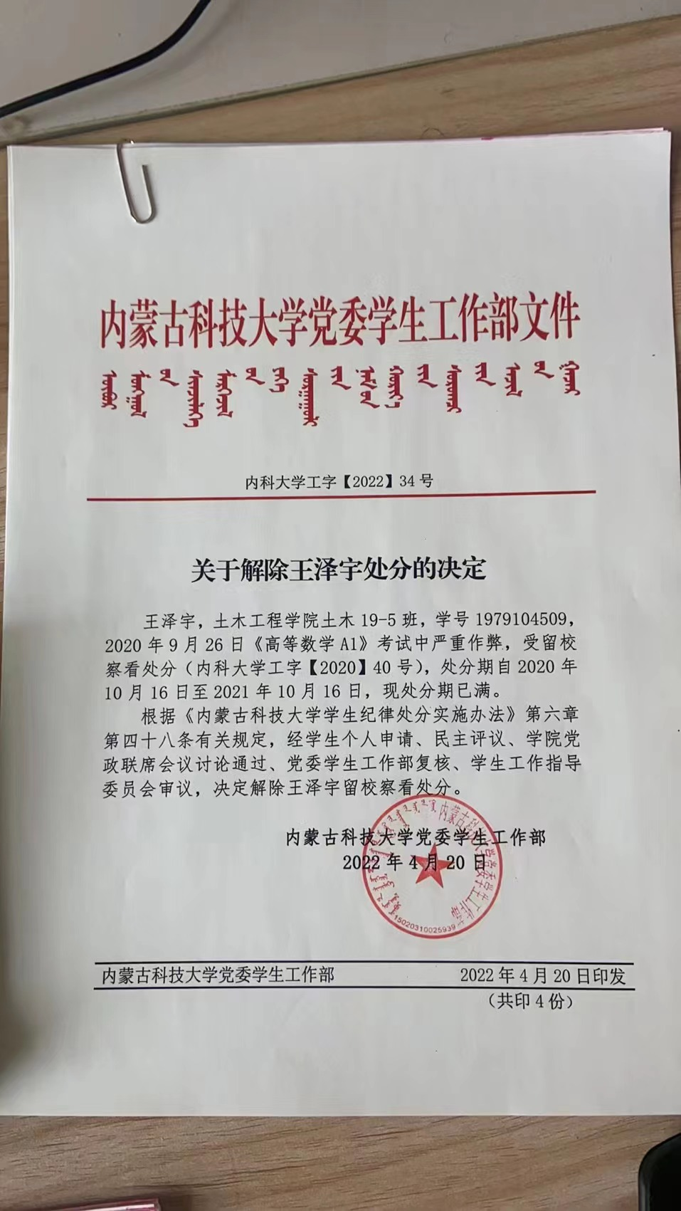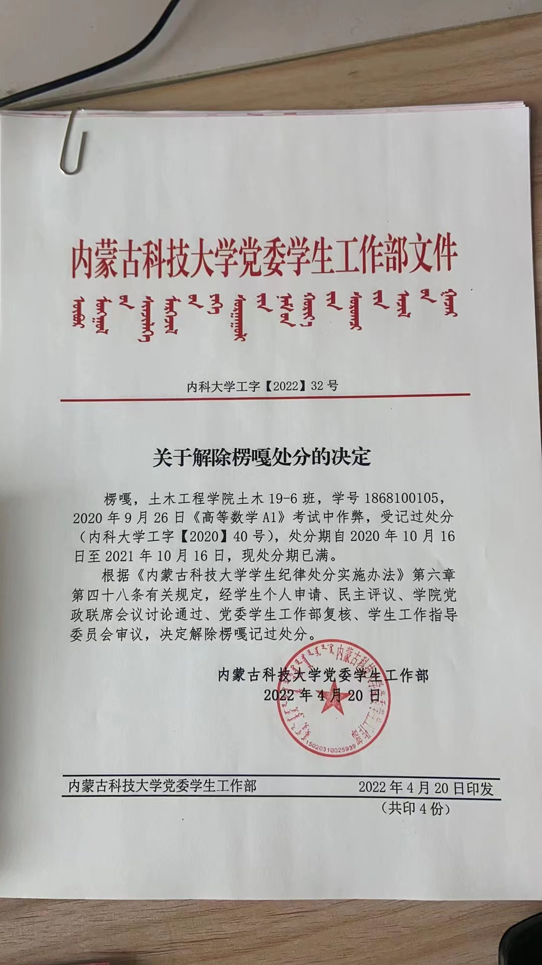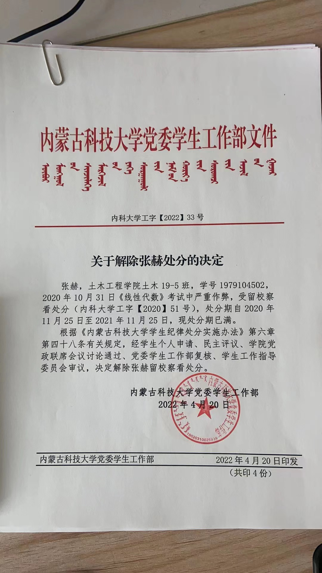 根据《永利官网学生纪律处分实施办法》有关规定,对受处分学生进行严格考察,yl8858永利集团召开党政联席会议形成评议结果,经学校审核,形成解除处分意见。