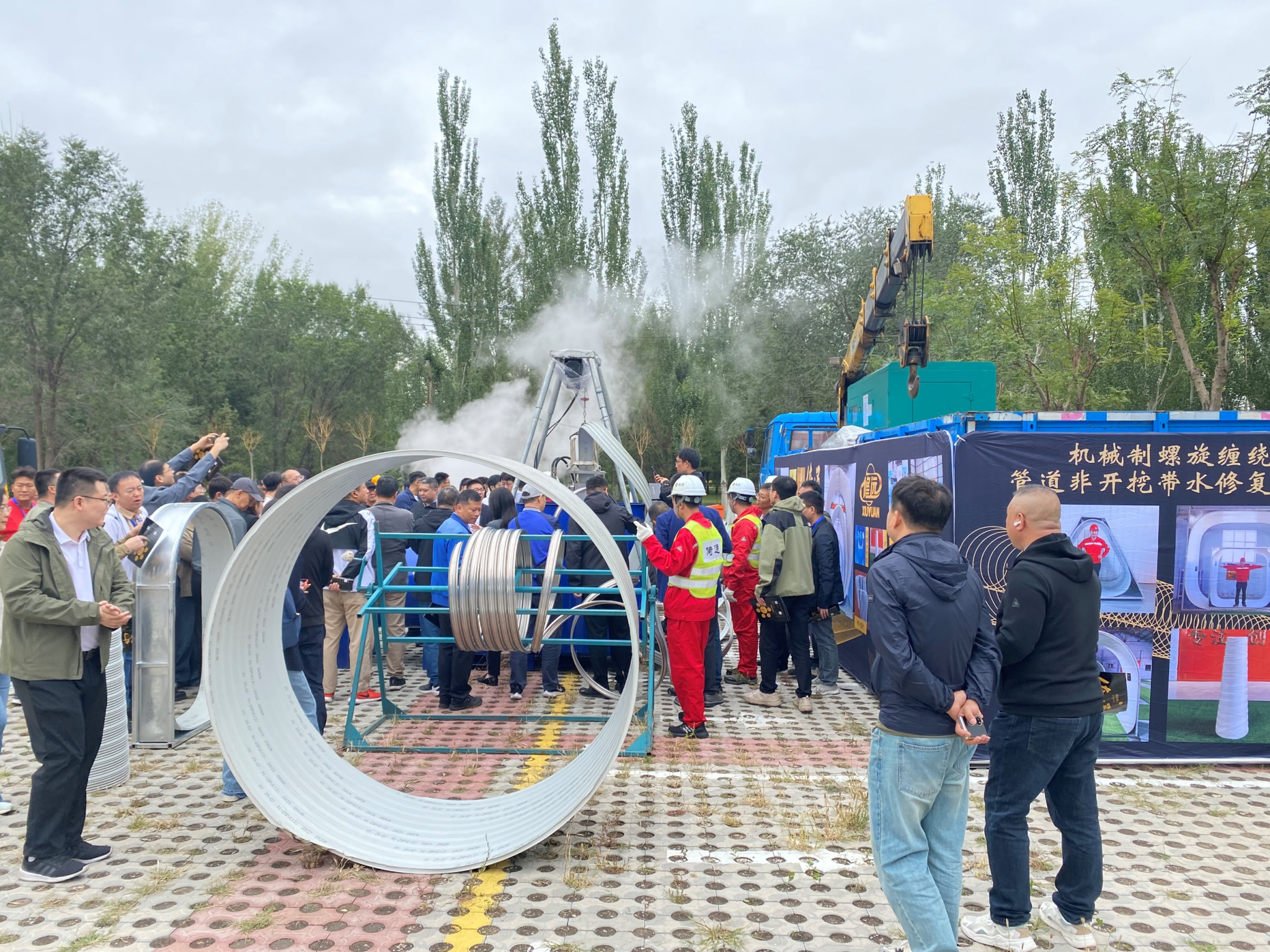 会议第三天(9月14日),组织参会人员参观了非开挖管道修复技术工法演示:CIPP紫外光固化修复(武汉中仪物联技术股份有限公司)、机械制螺旋缠绕非开挖带水修复技术(天津倚通科技发展有限公司)、热塑成型修复(杰瑞高科(广东)有限公司)、离心喷筑法检查井修复(武汉中地大与包头城建集团联合演示)、市政管道非开挖修复设备(包头城建集团股份有限公司)。通过参观工法演示,学者们对非开挖管道修复技术有了更加深入的认识和了解。