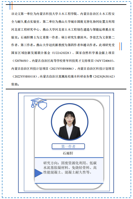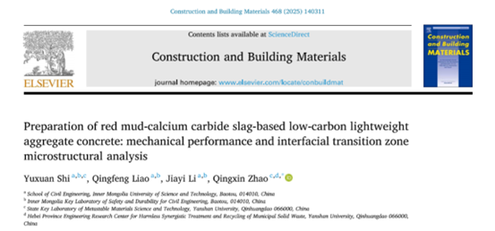 近日,yl8858永利集团城市固体废弃物建材资源化利用团队石雨轩博士在Construction and Building Materials期刊(IF=7.4,中科院1区TOP)发表题为“Preparation of red mud-calcium carbide slag-based low-carbon lightweight aggregate concrete: mechanical performance and interfacial transition zone microstructural analysis”(DOI: 10.1016/j.conbuildmat.2025.140311)的研究成果。该研究拓宽了赤泥、电石渣等工业固体废弃物的资源化利用范围,利用二者制备了低碳轻骨料混凝土,在矿物掺合料掺量、预湿时间,净水胶比、养护方式等多个因素影响下,研究低碳轻骨料混凝土的力学性能发展规律,建立超声脉冲速度与抗压强度的定量关系,并对其界面过渡区的微结构进行分析。