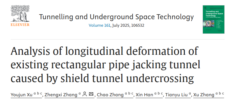 近日,yl8858永利集团城市隧道与地下工程团队许有俊教授在《Tunnelling and Underground Space Technology》期刊(IF=6.7,中科院1区TOP)发表题为“Analysis of longitudinal deformation of existing rectangular pipe jacking tunnel caused by shield tunnel undercrossing”(DOI: 10.1016/j.tust.2025.106532)的研究成果。该研究提出了地基刚度弱化函数与SP-T模型(一种基于地基刚度弱化的Pasternak - Timoshenko理论模型),并建立了新建盾构隧道下穿既有矩形顶管隧道的纵向沉降预测曲线。该研究系统揭示了等效抗弯与抗剪刚度对纵向沉降的耦合影响机制。通过参数分析发现,发现适当增加隧道埋深、新建与既有隧道之间的垂直间距均可有效减小最大沉降量,而夹角会同时改变既有隧道的最大沉降量与受影响范围。该成果为新建盾构隧道下穿既有矩形顶管隧道纵向变形问题提供了关键理论与数据支撑,是隧道交叉穿越领域的重要进展。