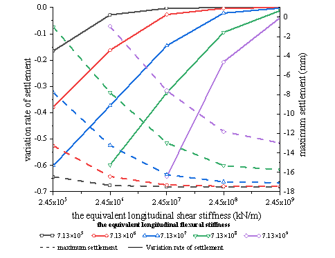 研究表明,最大纵向沉降量随抗弯刚度增大而减小,却随抗剪刚度提升而增加。当等效抗弯刚度与等效抗剪刚度之比小于0.1时((EI)eq/(kGA)eq<0.1),变化其中任意一项对既有隧道的最大沉降量的影响小于0.1mm。增加新旧隧道埋深或垂直距离均可减小最大沉降量,但垂直距离增大会显著扩展扰动范围,相比之下埋深增加对扰动范围的影响则较为有限。值得注意的是,新建盾构隧道与既有隧道穿越夹角越小,最大沉降量越大,但其沉降变化幅度逐渐减缓。