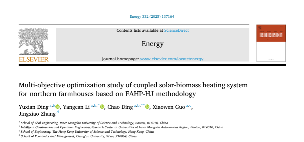 近日,yl8858永利集团智能建造与绿色可持续发展研究团队丁玉贤讲师在Energy期刊(IF=9,中科院1区TOP)发表题为“Multi-objective optimization study of coupled solar-biomass heating system for northern farmhouses based on FAHP-HJ methodology”(DOI: 10.1016/j.energy.2025.137164)的研究成果。该研究促进了可再生能源在建筑领域的推广应用,通过农村实际案例对联合供热系统进行实验,验证了基于双能源协同供暖策略下模型的可靠性,并创新性的使用FAHP-HJ算法对系统设备参数进行多目标优化,确定了太阳能-生物质能供暖系统的最佳配置方案。最终,对优化方案的能源、经济、环境和舒适性进行多维度讨论分析,以先进的建筑采暖多目标优化方法为建筑业的节能降碳提供了一个创新而高效的解决方案。