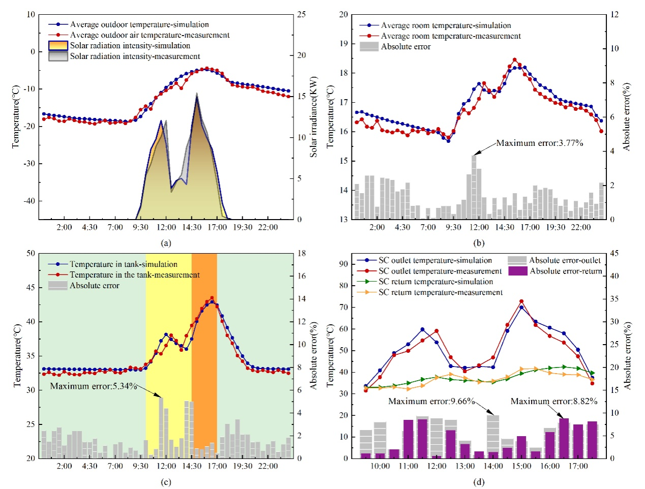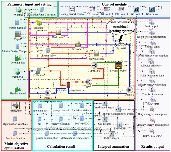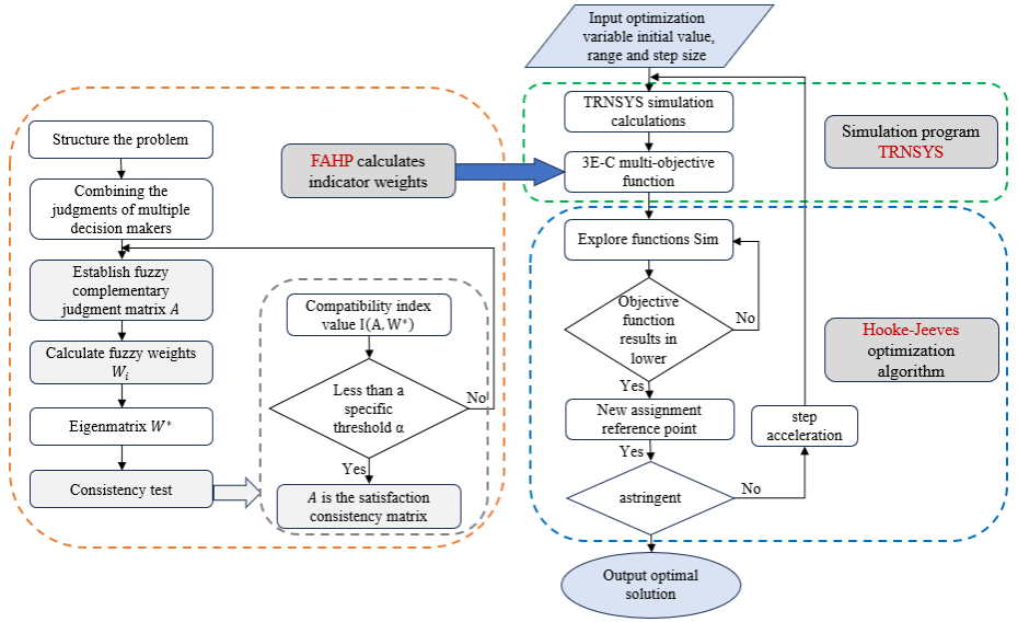 为解决太阳能与生物质能在供暖上的协同优化的问题,作者首先调研了区域供暖特征与自然资源情况,确定了农村典型建筑与供暖系统,并结合实测与模拟数据验证,建立了以能源、经济、环境和舒适性(3E-C)多维度指标为主导的综合评价模型,并运用FAHP与Hooke-Jeeves优化算法进行多目标优化,从而实现最优运行策略下的容量分配,加快可再生能源在农村地区的综合应用。