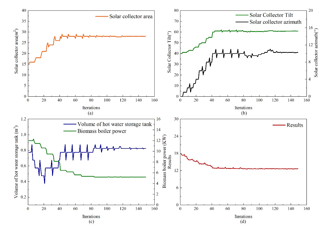 图5. Plot of iterative changes in the results of each decision variable and multi-objective function (a) Iterative plot of solar collector area; (b) Iterative plot of solar collector tilt and azimuth; (c) Iterative plot of hot water storage tank volume and biomass boiler power; and (d) Iterative plot of multi-objective function results