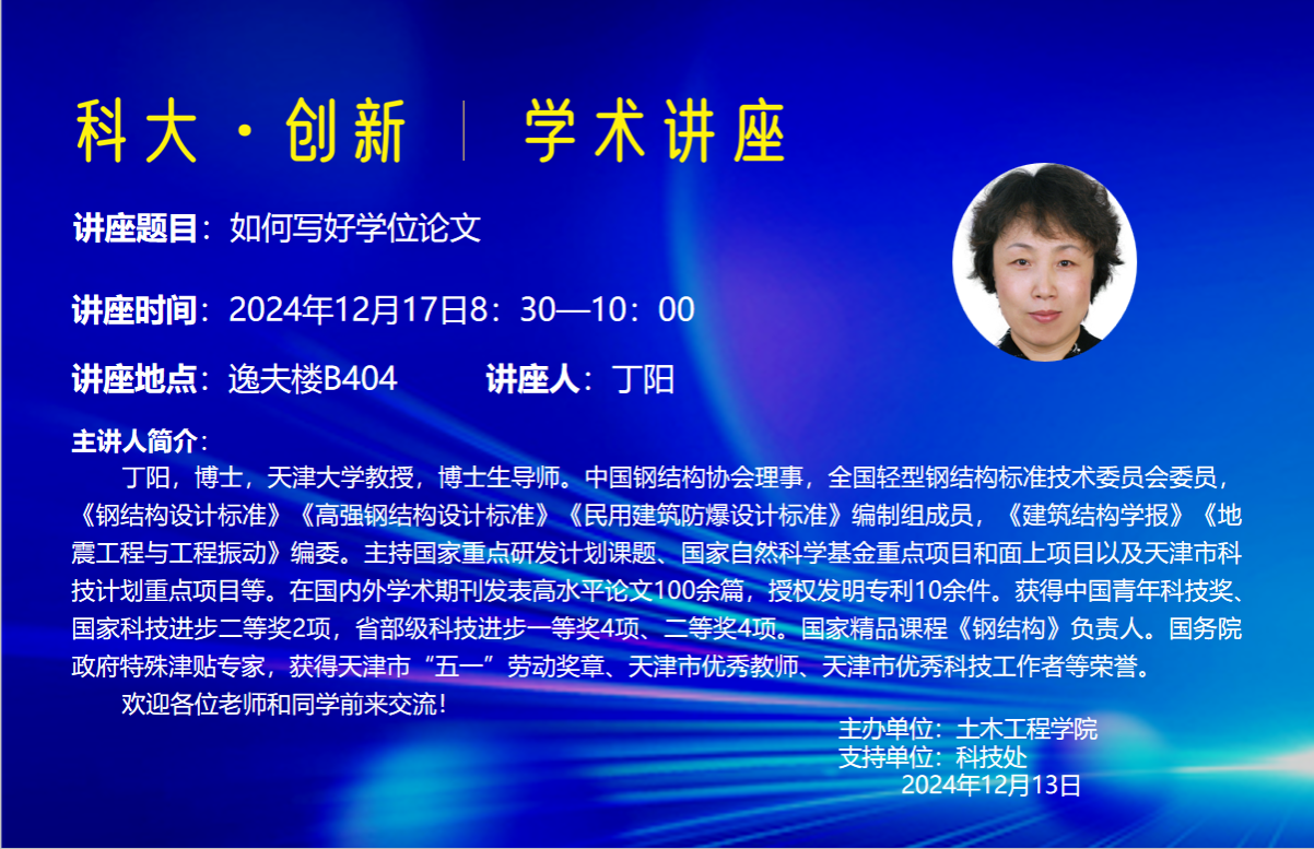 丁阳,博士,天津大学教授,博士生导师。中国钢结构协会理事,全国轻型钢结构标准技术委员会委员,《钢结构设计标准》《高强钢结构设计标准》《民用建筑防爆设计标准》编制组成员,《建筑结构学报》《地震工程与工程振动》编委。主持国家重点研发计划课题、国家自然科学基金重点项目和面上项目以及天津市科技计划重点项目等。在国内外学术期刊发表高水平论文100余篇,授权发明专利10余件。获得中国青年科技奖、国家科技进步二等奖2项,省部级科技进步一等奖4项、二等奖4项。国家精品课程《钢结构》负责人。国务院政府特殊津贴专家,获得天津市“五一”劳动奖章、天津市优秀教师、天津市优秀科技工作者等荣誉。