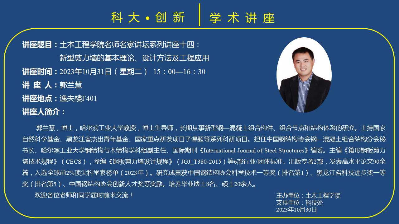 郭兰慧,博士,哈尔滨工业大学教授,博士生导师,长期从事新型钢—混凝土组合构件、组合节点和结构体系的研究。主持国家自然科学基金、黑龙江省杰出青年基金、国家重点研发项目子课题等系列科研项目。担任中国钢结构协会钢—混凝土组合结构分会秘书长、哈尔滨工业大学钢结构与木结构学科组副主任、国际期刊《International Journal of Steel Structures》编委。主编《箱形钢板剪力墙技术规程》(CECS),参编《钢板剪力墙设计规程》(JGJ_T380-2015)等6部行业/团体标准。出版专著2部,发表高水平论文90余篇,入选全球前2%顶尖科学家榜单(2023年)。研究成果获中国钢结构协会科学技术一等奖(排名第1)、黑龙江省科技进步奖一等奖(排名第5)、中国钢结构协会创新人才奖等奖励。培养毕业博士8名、硕士20余人。