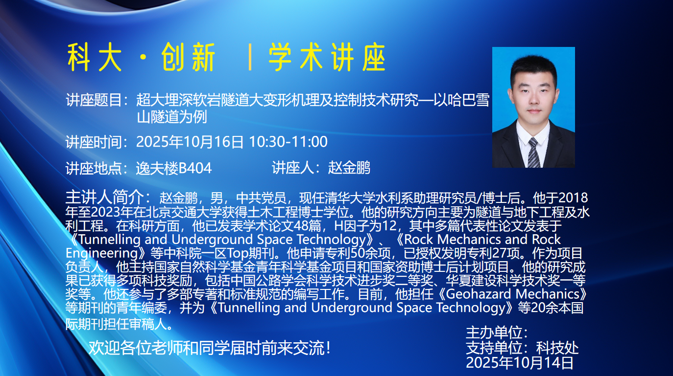 讲座题目:超大埋深软岩隧道大变形机理及控制技术研究——以哈巴雪山隧道为例