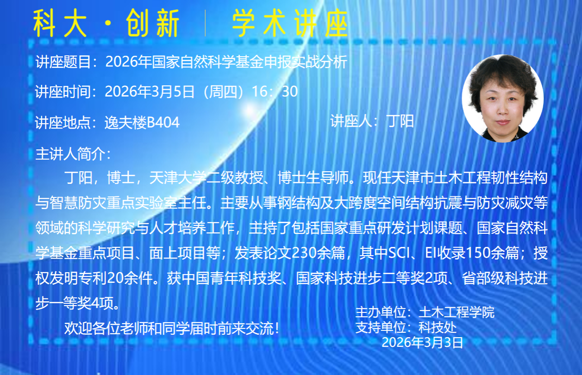 丁阳,博士,天津大学二级教授、博士生导师。现任天津市土木工程韧性结构与智慧防灾重点实验室主任。主要从事钢结构及大跨度空间结构抗震与防灾减灾等领域的科学研究与人才培养工作,主持了包括国家重点研发计划课题、国家自然科学基金重点项目、面上项目和一批国家重点工程委托科研项目等;发表论文230余篇,其中SCI、EI收录150余篇;授权发明专利20余件。获中国青年科技奖、国家科技进步二等奖2项、省部级科技进步一等奖4项等。为国家精品课程《钢结构》负责人,编写国家级规划教材《钢结构设计原理》。获评国务院政府特殊津贴专家,获得天津市“五一”劳动奖章、天津市优秀教师、天津市优秀科技工作者等荣誉。参编参编国家标准2部、协会标准1部,担任《建筑结构学报》《钢结构》(中英文)等期刊编委。