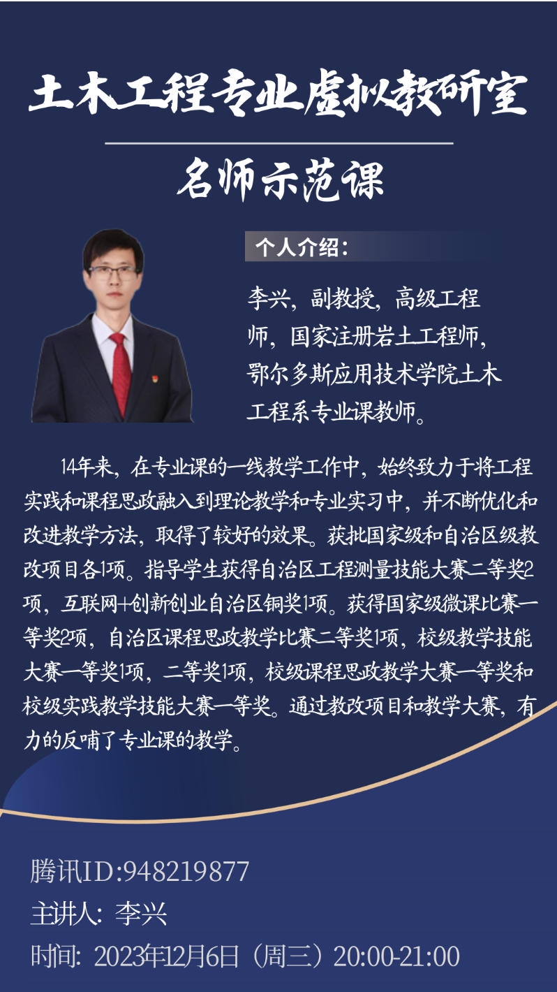 2023年12月6日晚,鄂尔多斯应用技术学院土木工程系虚拟教研室“名师示范课”系列活动顺利开展。李兴副教授以“土木工程专业课程中的思政融入路径与实践策略”为主题,通过腾讯会议平台带来了一场内容丰富、启发性强的教学示范课,吸引了众多高校教师与教育工作者的积极参与。