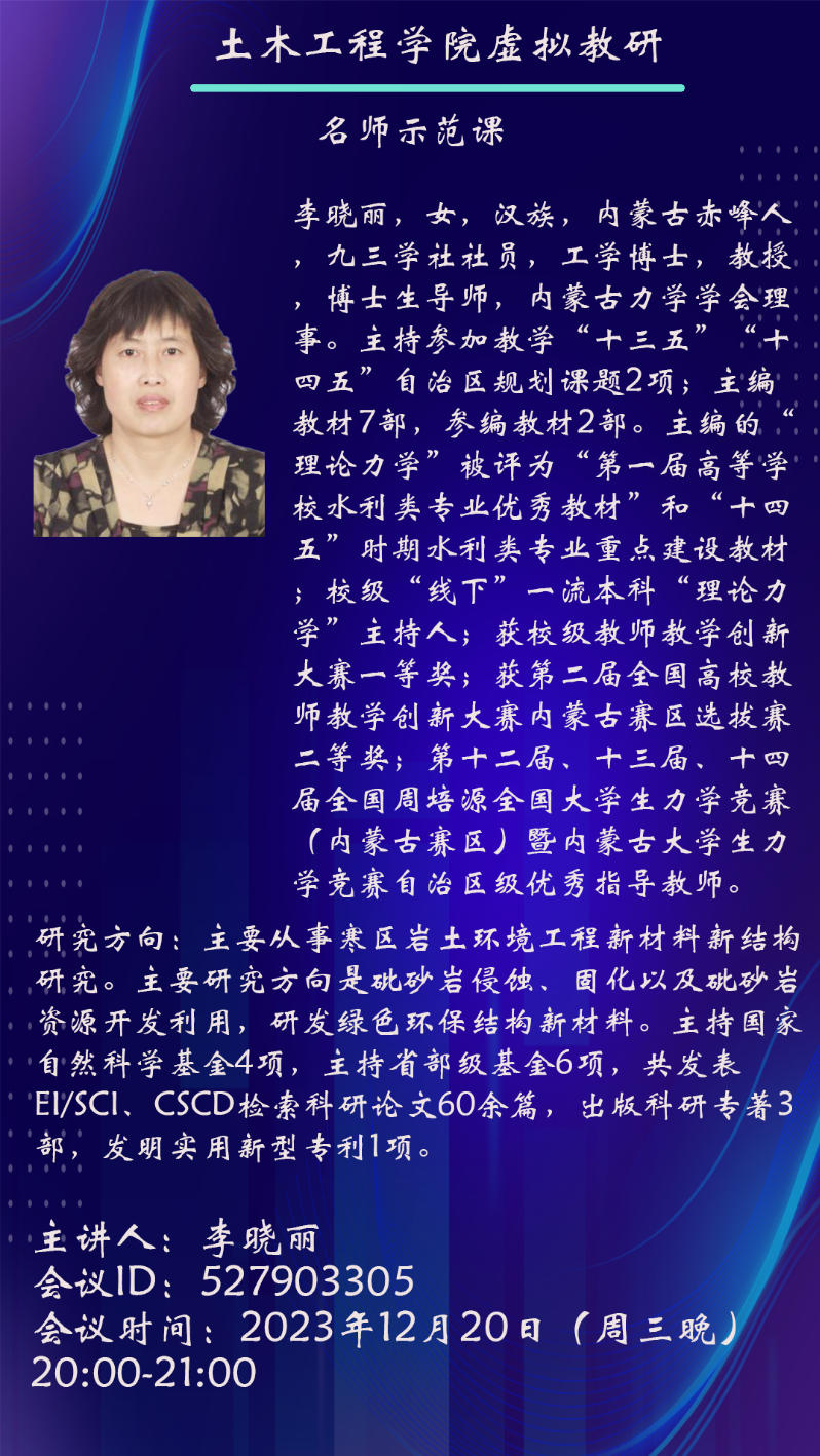 2023年12月20日晚,yl8858永利集团虚拟教研室“名师示范课”系列第二场活动顺利举行。李晓丽教授以“力学教学创新与科研反哺课堂的探索与实践”为主题,通过腾讯会议平台带来了一场内容丰富、见解独到的教学盛宴,吸引了全国多所高校教师与研究生的积极参与。