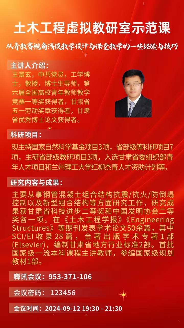 2024年9月12日晚,土木工程虚拟教研室示范课第四场活动成功举办。全国高校青年教师教学竞赛一等奖获得者、兰州理工大学王景云教授,以"从青教赛视角谈教学设计与课堂教学"为主题,通过腾讯会议平台奉献了一场精彩纷呈的教学经验分享会,吸引了全国近500名高校教师在线参与。