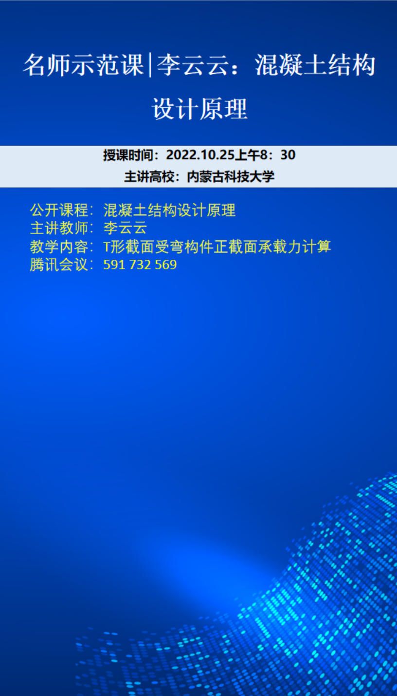 2022年10月25日上午,土木工程专业虚拟教研室名师示范课系列活动迎来混凝土结构设计原理专题课程。永利官网李云云老师以"T形截面受弯构件正截面承载力计算"为教学内容,通过腾讯会议平台呈现了一堂精彩的专业基础课教学示范。